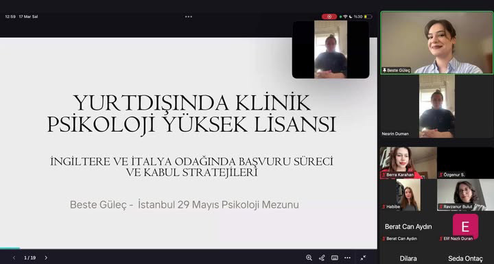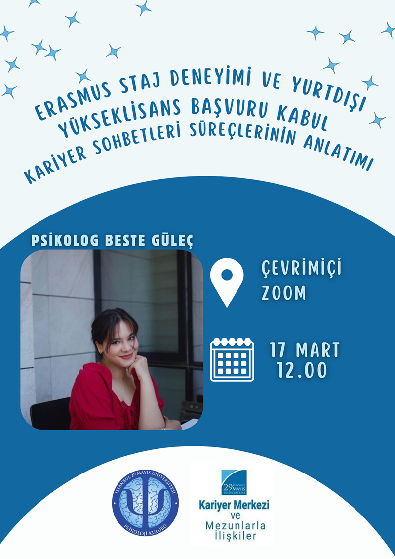 29 Mayıs Psikoloji Kulübü ve Kariyer Merkezi tarafından düzenlenen Erasmus Staj Deneyimi ve Yurt Dışı Yüksek Lisans Başvuru Süreçleri konulu çevrimiçi etkinlik, psikoloji öğrencilerinin katılımıyla gerçekleştirildi. Psikolog Beste Güleç’in konuşmacı olduğu etkinlikte, özellikle klinik psikoloji alanında yurt dışı başvuru süreçlerine dair kapsamlı ve yol gösterici bilgiler paylaşıldı.
