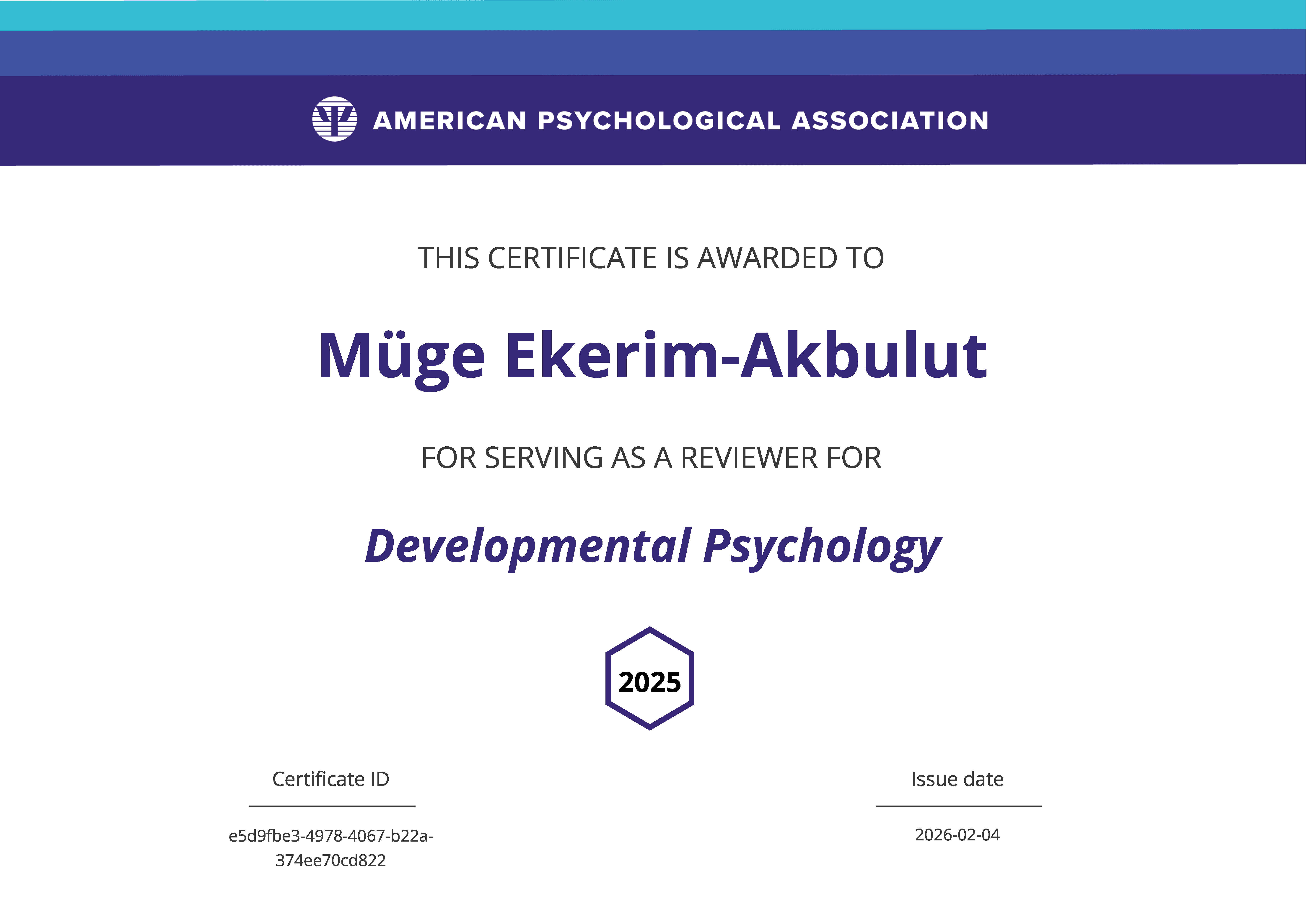 Psikoloji bölümü Doktor Öğretim Üyesi Müge Ekerim Akbulut, Amerikan Psikoloji Birliği (American Psychological Association) tarafından yayınlanan alanın en prestijli ve yüksek etki faktörlü dergilerinden Developmental Psychology dergisinde yaptığı hakemlik ve değerlendirmeler sonucu hakemlik sertifikasıyla ödüllendirilmiştir.